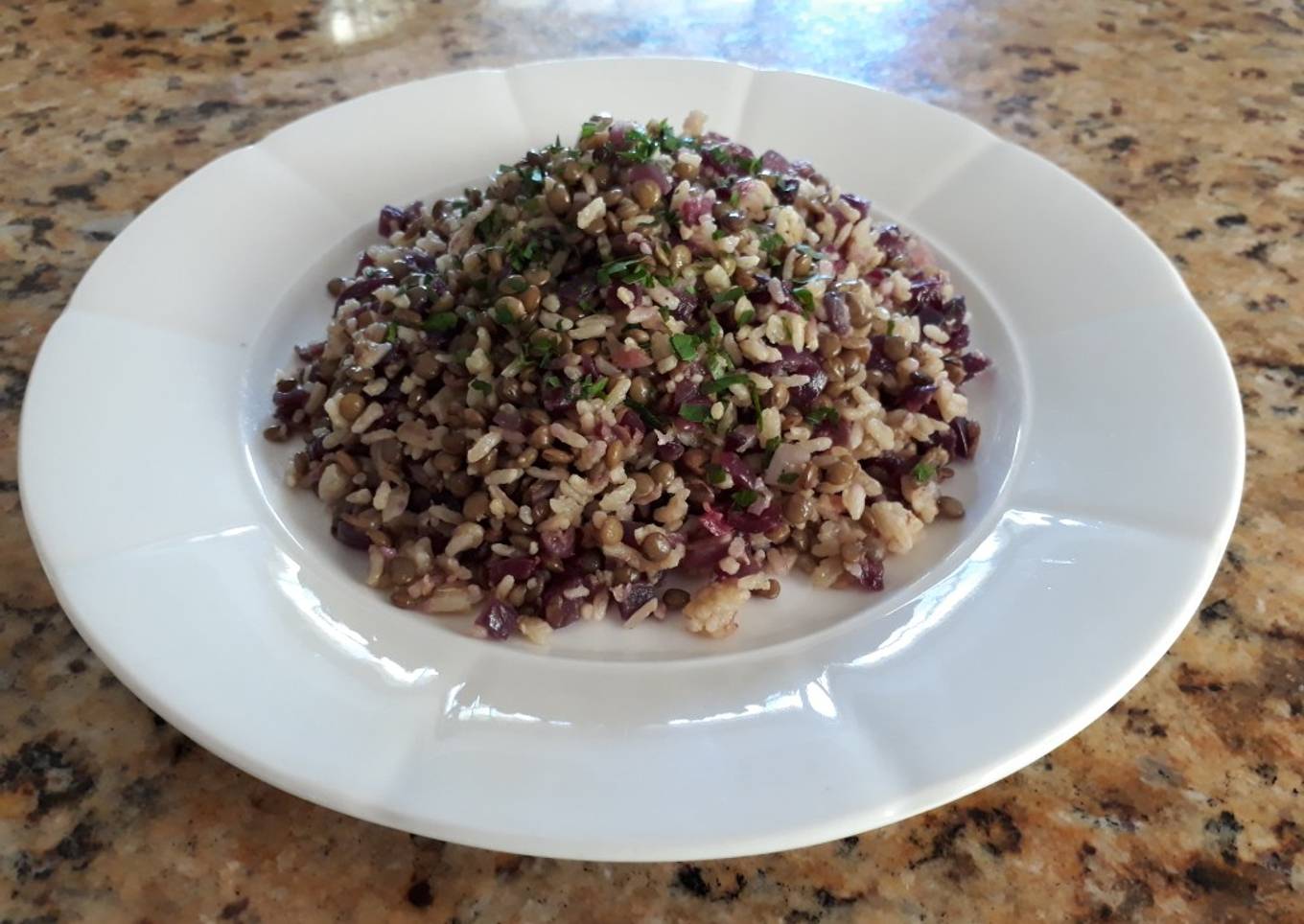 - Mezclar las lentejas, la cebolla y el arroz. Condimentar con sal (si hiciera falta), aceite de oliva, jugo y ralladura de lima (o limón). Terminar con perejil fresco picado.
